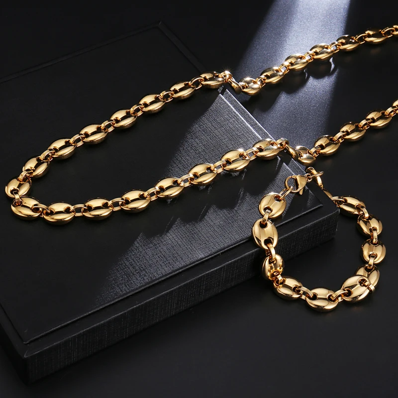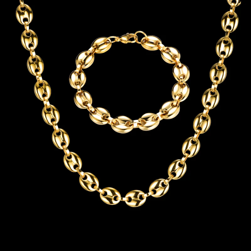Bold links. Unapologetic energy. This statement jewelry set features chunky coffee bean chain links crafted from durable stainless steel, blending streetwear edge with modern elegance. Designed for both men and women, it’s a unisex expression of confidence, rhythm, and rebellion.