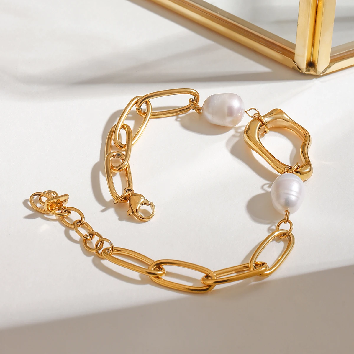 The 18K‑plated stainless steel paperclip chain bracelet with an irregular freshwater pearl blends coastal poetry with modern elegance, creating a piece that feels both timeless and effortlessly stylish. The contrast between the bold, thick chain and the organic beauty of the pearl gives the bracelet a classic–meets–vintage character, while the polished gold finish adds a warm, luxurious glow. Its waterproof construction and stainless-steel core ensure lasting shine, making it a piece you can wear from morning light to evening celebrations without worry.