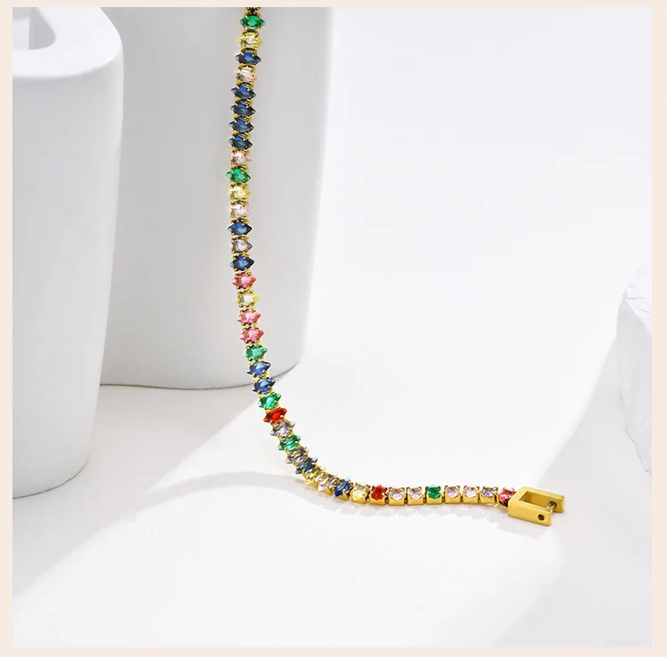 A radiant celebration of color, this Colorful Cubic Zirconia Tennis Bracelet sparkles with brilliance and charm. Each finely cut zirconia stone glimmers like a prism of light, linked together in a polished stainless steel chain that offers both durability and elegance. Designed for women who embrace vibrancy, it is a timeless accessory that blends fashion with meaning.